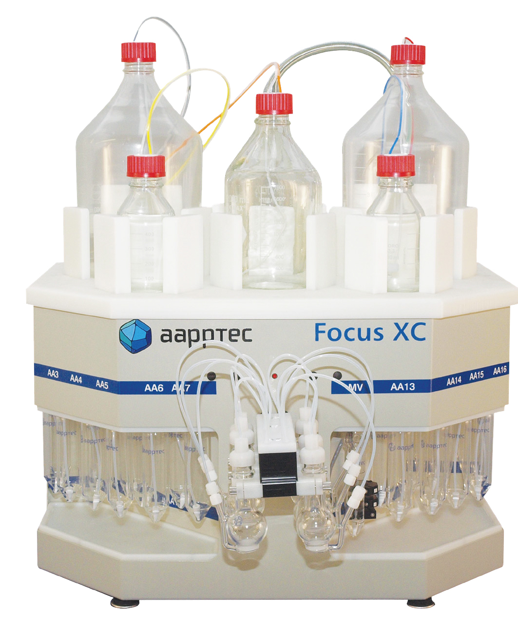 FOCUS XC是一台易学易用的全自动多通道固相多肽合成仪,可以配备2,4,6个反应器,能够同时合成最多六条不同长度不同规模的肽,具备24个氨基酸瓶,6-7个溶剂试剂管线,每个反应器合成规模可以从0.01 毫摩尔到5毫摩尔。界面友好的智能软件为不同专业程度的用户提供了多样的合成可能性。